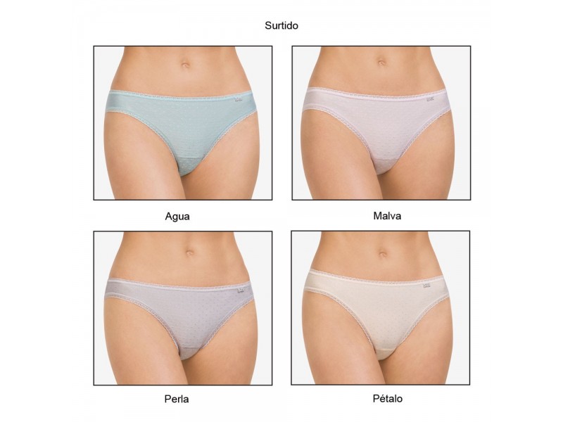Bikini mujer con adorno encaje y bordado guipur. Composicion: 45% Algodon Peinado,45 % Poliamida, 10% Elastomero. Color surtido(Agua-Malva, Perla-Petalo) (Pack 2 unidades). Presentacion bolsa de cierre tipo zip.